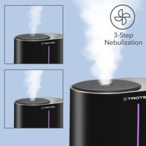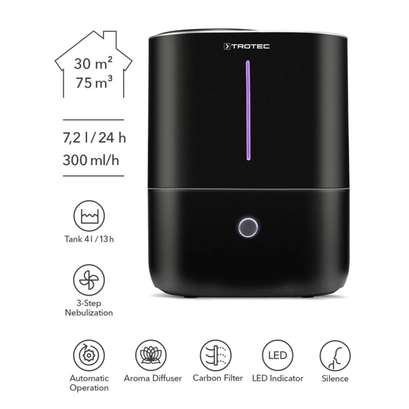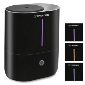 Trotec B 2 E – це ультразвуковий зволожувач повітря 3-в-1 для побутового використання (додому, в офісі чи дитячій кімнаті), який поєднує функції зволоження, очищення та ароматизації повітря. Прилад має вугільний повітряний фільтр для зменшення забруднень та запахів, LED-індикатор вологості, автоматичний режим з контролем вологості (гігростат), кілька рівнів інтенсивності розпилення та автоматичне відключення при закінченні води. Великий 4-літровий бак забезпечує до ~13 год безперервної роботи, а низький рівень шуму дозволяє використовувати пристрій навіть у спальні чи дитячій кімнаті.